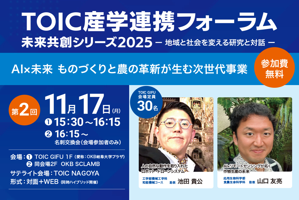 オープンイノベーションの産学融合拠点Tokai Open Innovation Complex(TOIC)岐阜サイトの産学連携イベントを実施します。